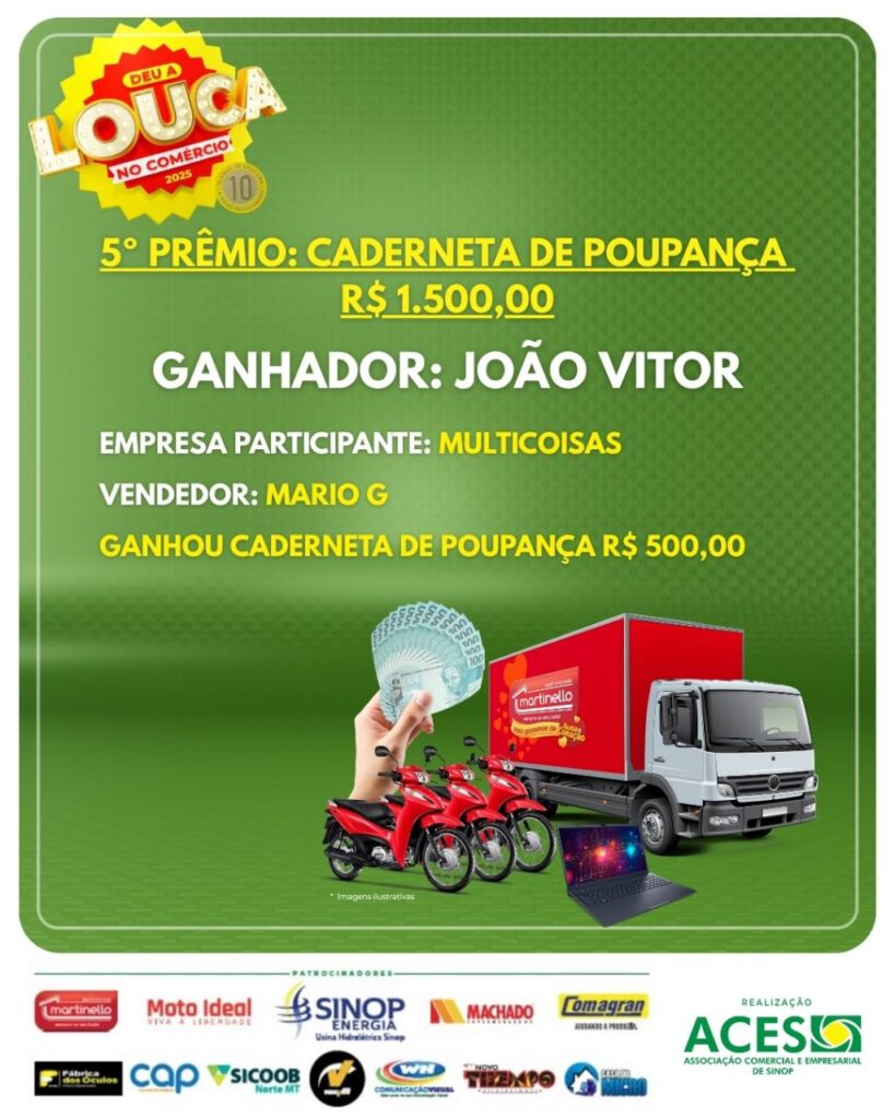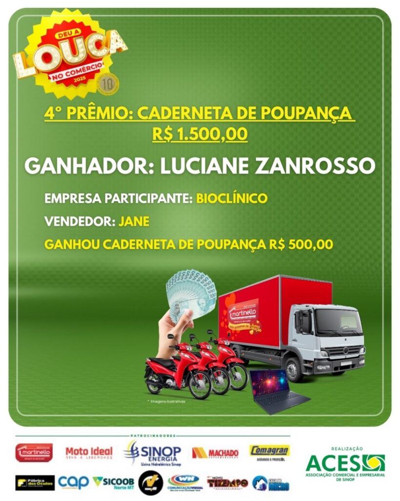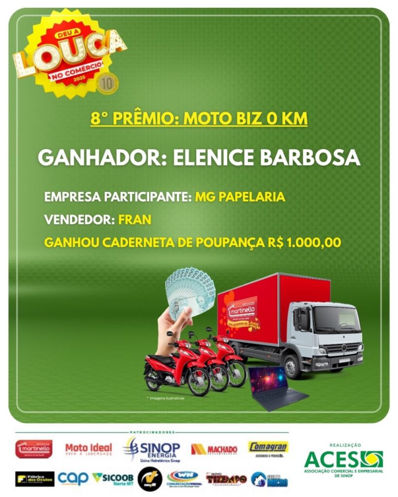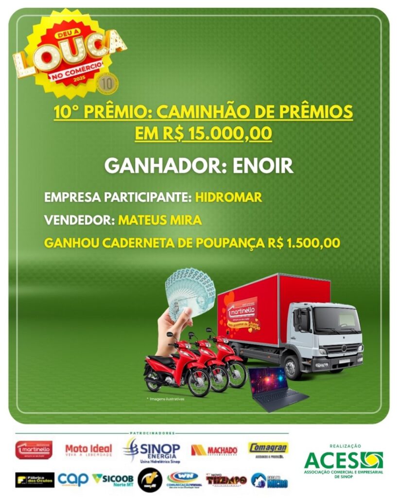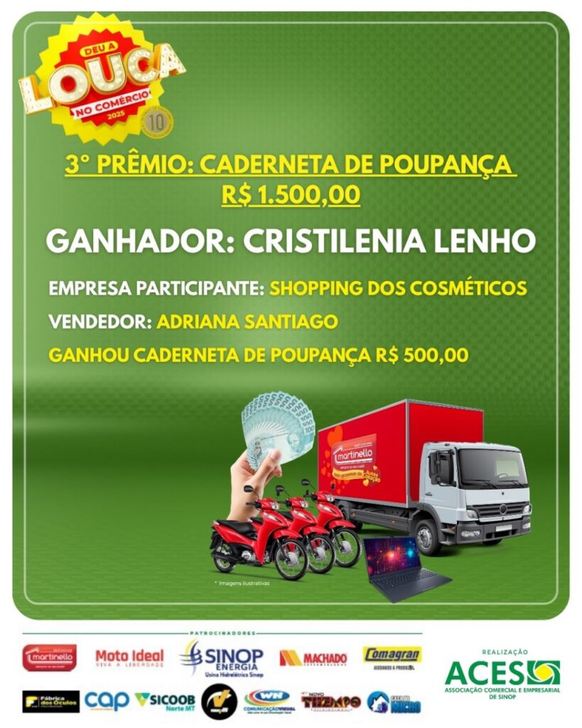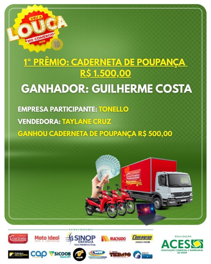 “A Deu a Louca no Comércio é muito mais que uma campanha: é uma corrente de valorização do nosso comércio e de conexão entre empresários e consumidores. Cada cupom representa um negócio gerado, uma venda realizada e a economia fortalecida. Essa é a força da união associativista de Sinop”, destacou o presidente da ACES, Fabio Migliorini.