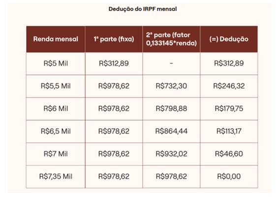 Contribuintes com renda entre R$ 5.000 e R$ 7.350 mensais terão acesso a um crédito que diminui o imposto a ser pago. O desconto será de 100% para quem ganha R$ 5.000, reduzindo-se gradualmente até 0% para quem receber R$ 7.350.