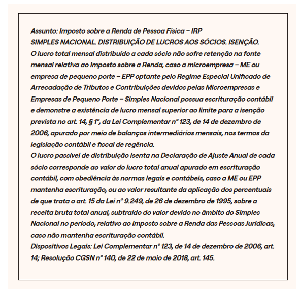 Destaca-se que lucros distribuídos por empresas do Simples Nacional não estão sujeitos à retenção mensal de 10%, ainda que ultrapassem R$ 50 mil no mês, permanecendo, contudo, incerteza quanto ao tratamento no cálculo anual do IRPF mínimo.