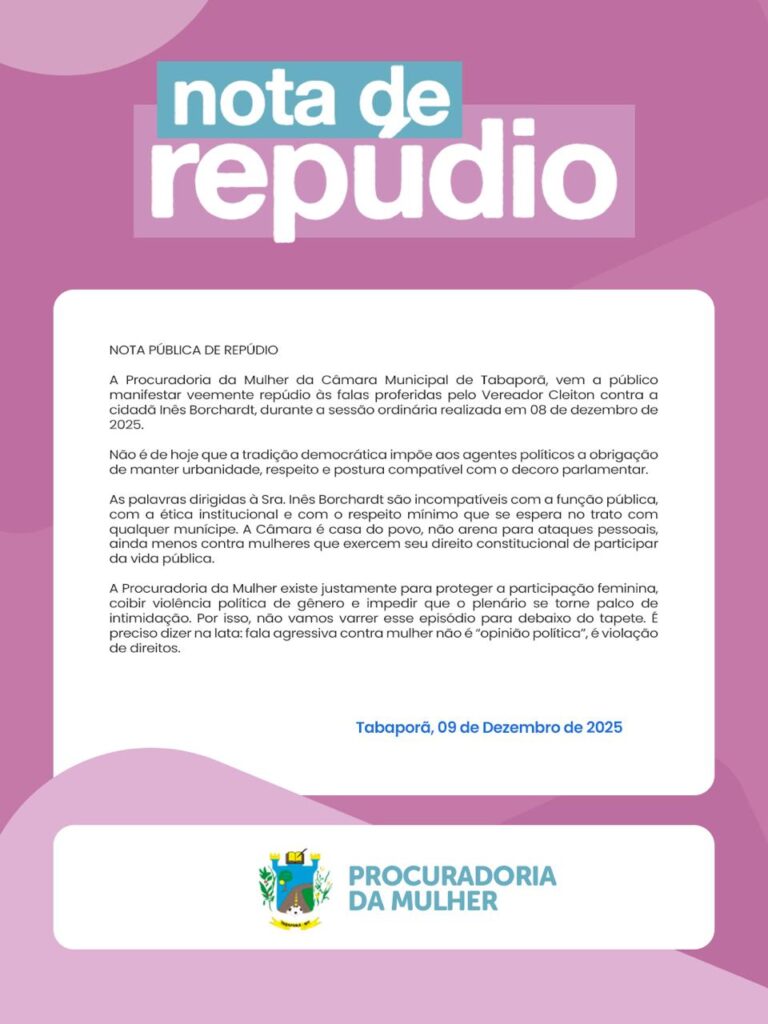 A Procuradoria da Mulher da Câmara Municipal de Tabaporã tornou público, nesta terça-feira (09), um pronunciamento oficial de repúdio às declarações feitas pelo vereador Cleiton contra a cidadã Inês Borchardt durante a sessão ordinária realizada no dia 8 de dezembro de 2025.